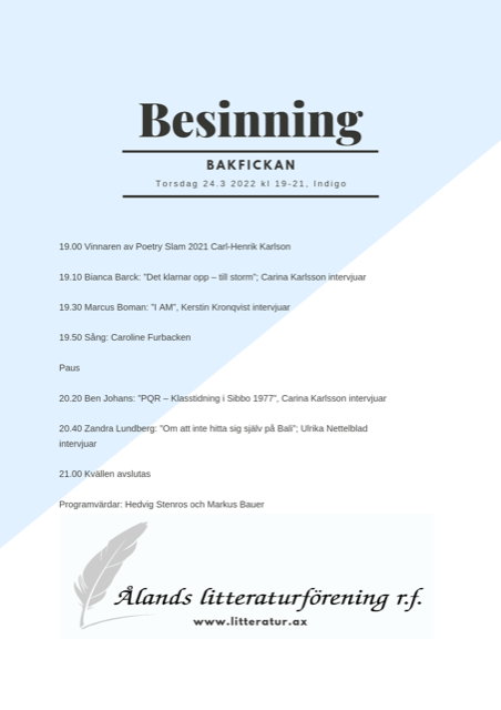 Torsdag 24 mars är det dags för Bakfickan, litteraturföreningens inledning på Mariehamns litteraturdagar. Platsen är restaurang Indigos bistro och tidpunkten 19.00.