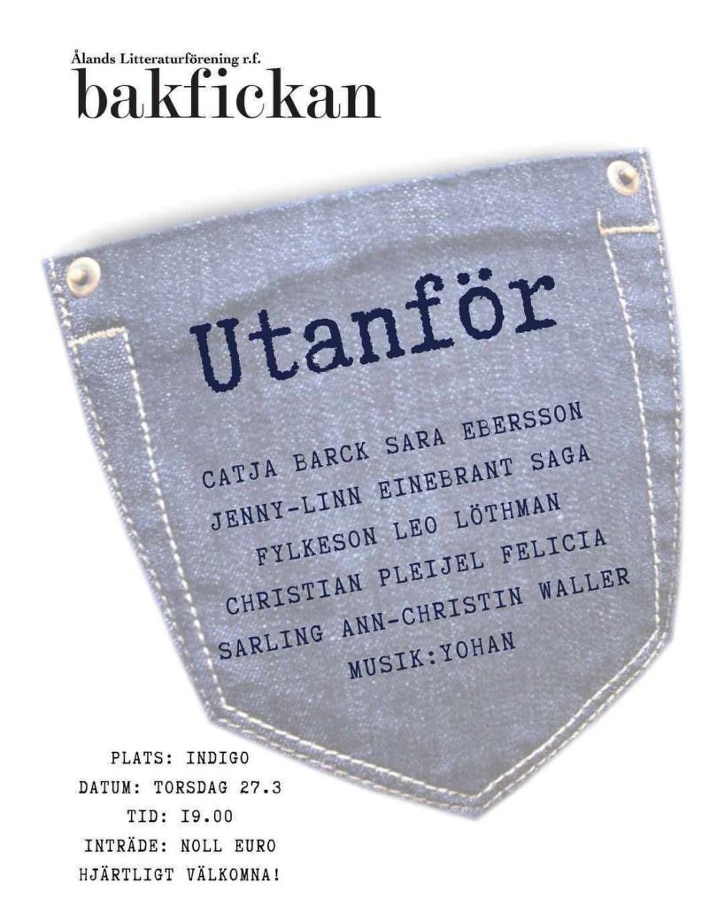 Torsdag 19.3 inleder vi årets litteraturdagar med litteraturföreningens eget evenemang Bakfickan. Här lyfter vi fram åländska skribenter och varvar med lite åländsk musik. Årets Bakficka har rubriken ”Tillfreds”, och våra författargäster i år är: